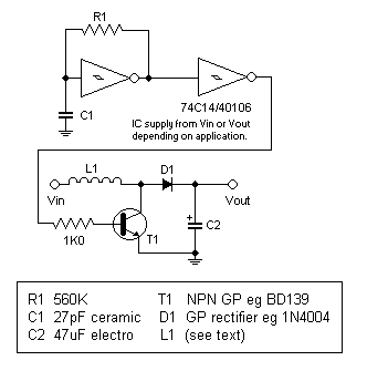 Input voltage versus output voltage The first setup of this circuit used the solenoid and a 9v battery. The output was around 41v with no load. With the 60 turn coil, it exceeded 80v! (With a 50v rated capacitor for C2 I didn't leave this running for long...) What I found more interesting was using a single AA cell (1.5v). You may get mixed results because the 74C14/40106 schmitt trigger inverter may not be able to work at voltages this low. One trick you can do is to power the 74C14/40106 from the output voltage. The only problem is that the circuit needs a kick start, since it can't step up voltage until the oscillator is running. I found that a 10k resistor across the diode (normally 0.6v drop) provided sufficient voltage to get the oscillator started, without affecting the output too much. Startup is not instantaneous because the output capacitor needs to charge. Another way to get it started is to temporarily connect a 3-9v battery in series with a 10k resistor to the supply rails of the 74C14/40106. This method is more reliable but it's not so practical since you need another power source. However, if you are using this circuit to do something like charge a 6v battery from a 1.5v solar cell, then you can simply power the 74C14/40106 from the battery. Output stability and regulation There is none. The output voltage will dip as you load it more. While you can use a series regulator such as a 7812 or 7805 on the output (take care not to exceed their maximum input voltage) I'm guessing that pulse width modulation (PWM) of the 40KHz square wave would be a more efficient method of regulation. I haven't looked into this yet as it adds more complexity to the circuit, requiring some sort of feedback to vary the duty cycle. A PIC or Atmel with an A/D converter and a spare output, plus some fancy programming, would probably do the trick. Conclusion This is a basic circuit only and it can be improved in many ways. Building it on a breadboard makes it easy to fiddle with values of components. Make sure you don't accidentally exceed the ratings of any components if you manage to find a variation that steps up 12v by 10 times! Note added September 2009 - I get a lot of emails from people asking for detailed help with modifying this circuit. I'm not an engineer - my knowledge of electronics is elementary to intermediate. In addition, I haven't fiddled with this circuit for nearly 10 years (this article was written in early 2000) so I cannot offer any further assistance beyond the text of this page. Thanks and apologies for any inconvenience.